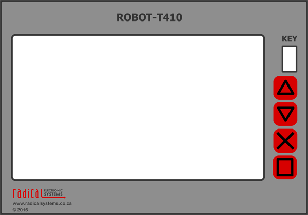 The Robot-T410 is a small industrial terminal with a metal housing, colour LCD screen and touch support. It has various communications ports to connect to the outside world. It has a robust enclosure making it suited for harsh environments like factories. It features a resistive touch screen for factory workers with gloves, but the navigation keys are capacitive touch to add robustness to the prodcut.